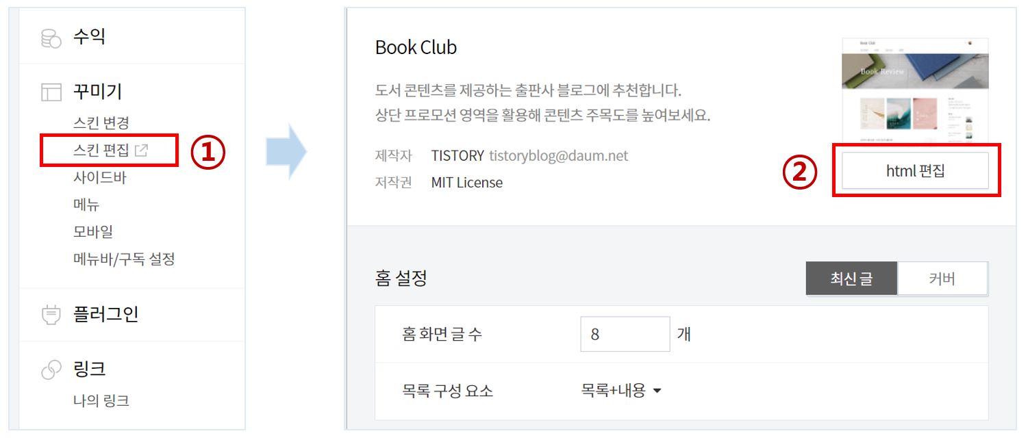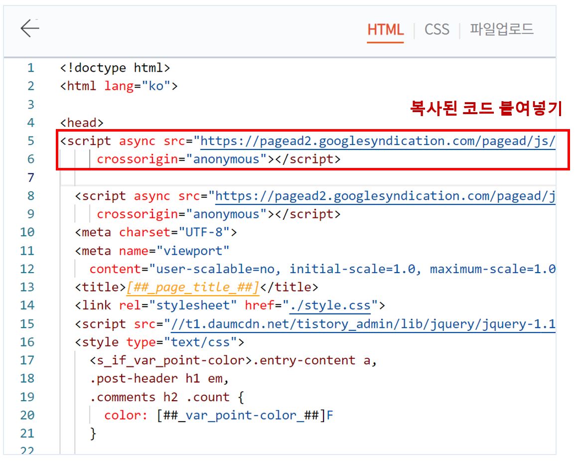 ③ 티스토리 블로그 스킨편집에서 코드 복사해 넣기